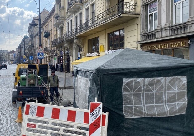 У Львові на проспекті Свободи плитку обробляють піскоструменем